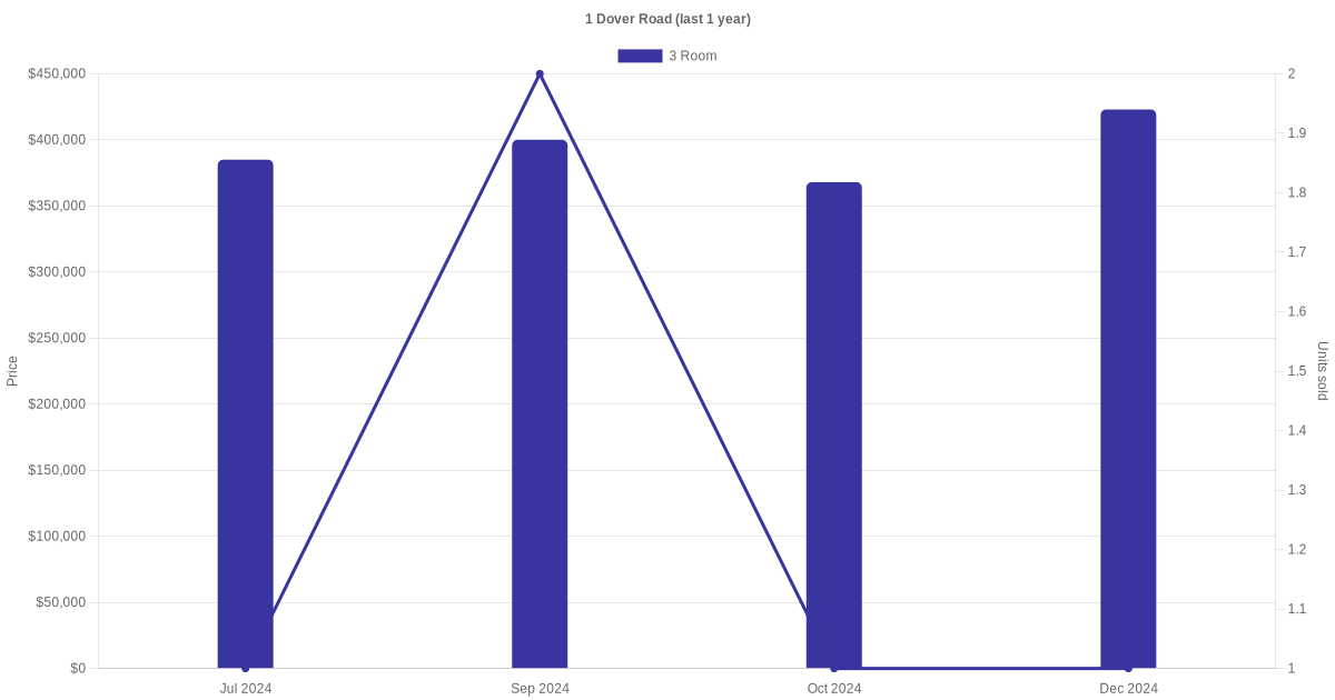 Below is a quick summary of the resale transactions volume and average price trends for the 3 room units at 1 Dover Road.