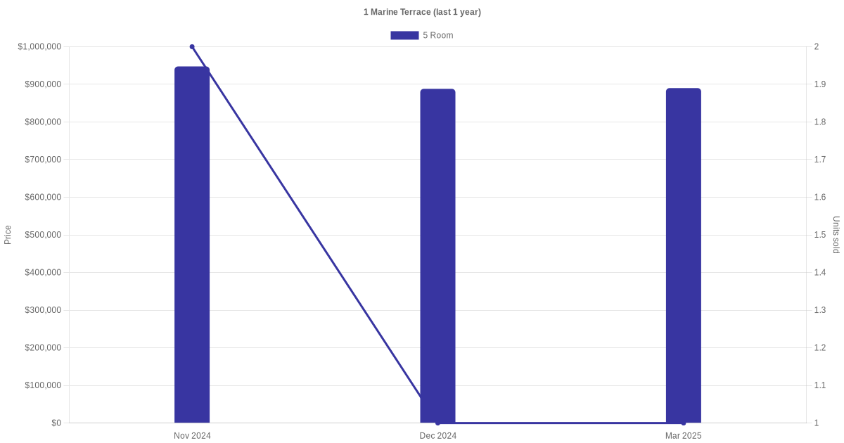 Below is a quick summary of the resale transactions volume and average price trends for the 5 room units at 1 Marine Terrace.
