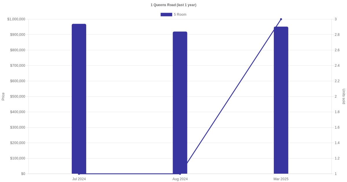 Below is a quick summary of the resale transactions volume and average price trends for the 5 room units at 1 Queen's Road.