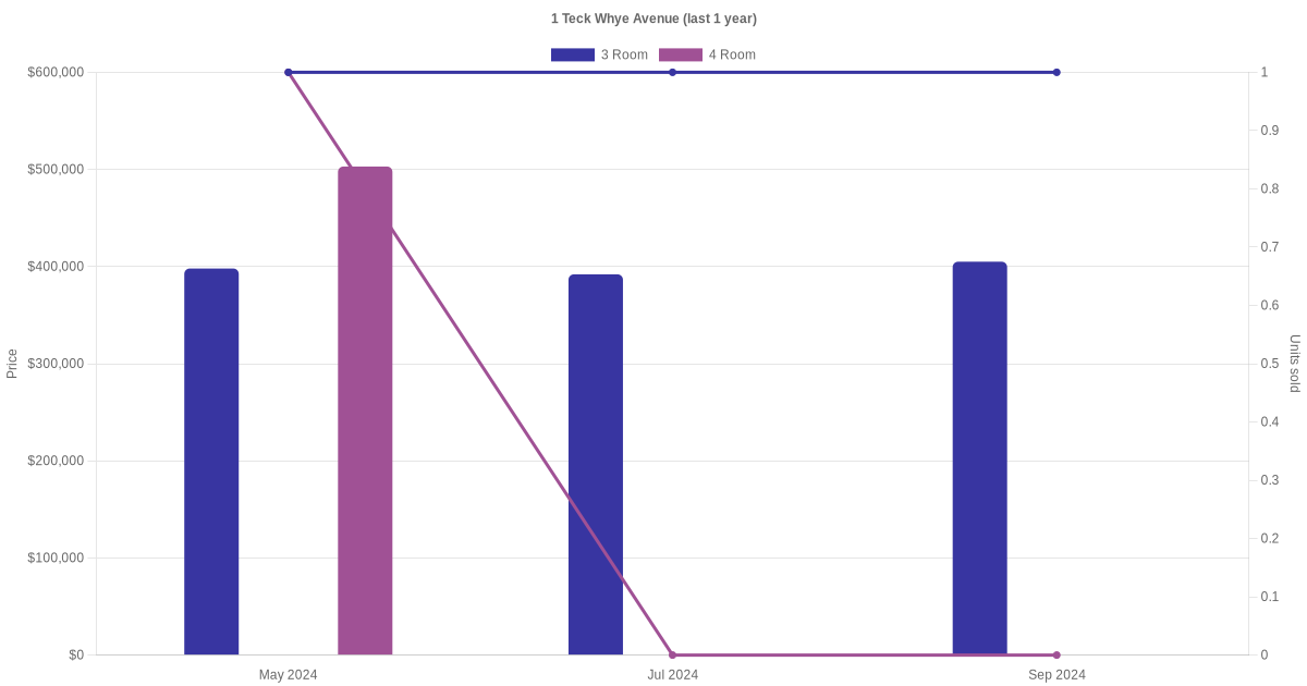 Below is a quick summary of the resale transactions volume and average price trends for the 3 room and 4 room units at 1 Teck Whye Avenue.