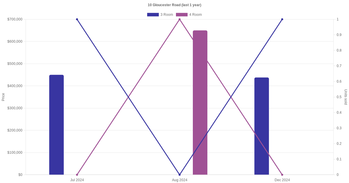 Below is a quick summary of the resale transactions volume and average price trends for the 3 room and 4 room units at 10 Gloucester Road.