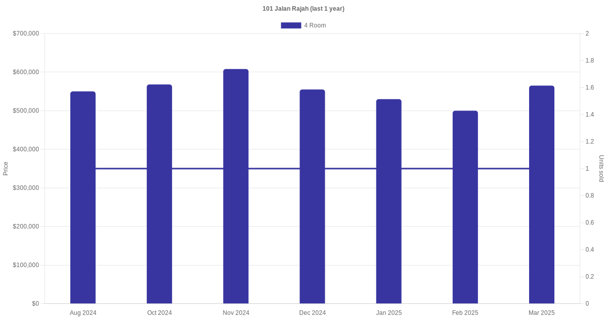 Below is a quick summary of the resale transactions volume and average price trends for the 4 room units at 101 Jalan Rajah.