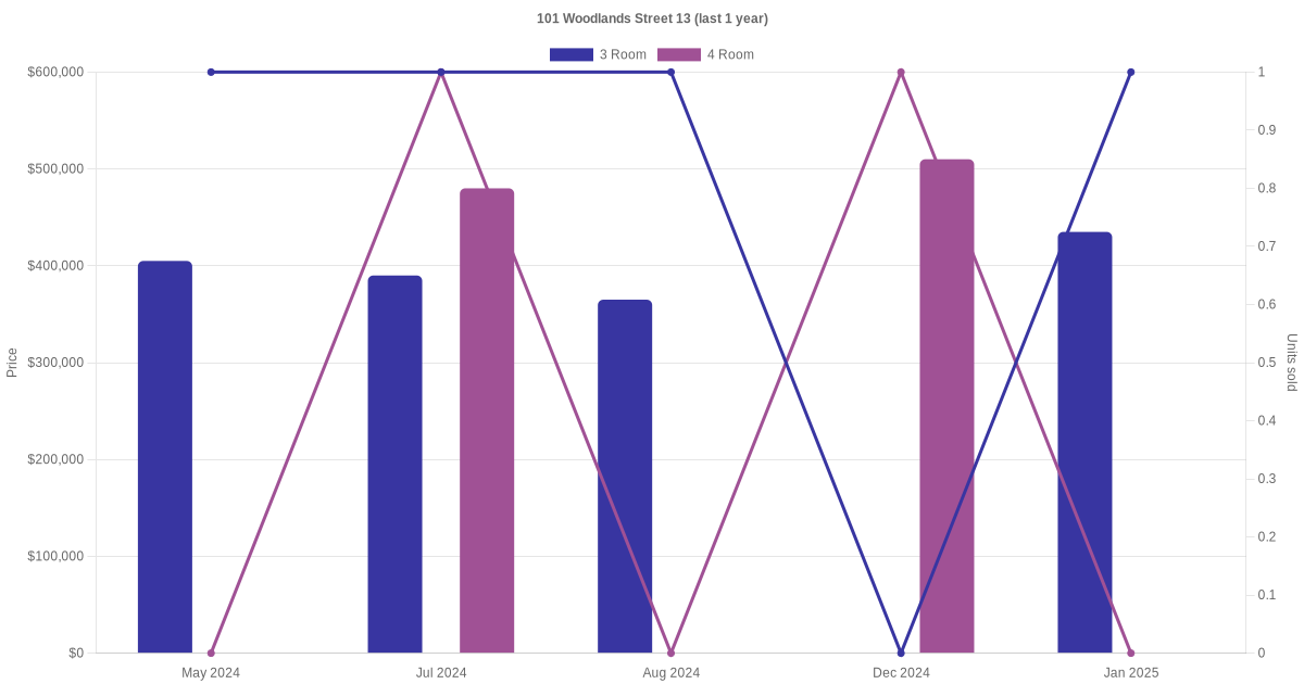 Below is a quick summary of the resale transactions volume and average price trends for the 3 room and 4 room units at 101 Woodlands Street 13.