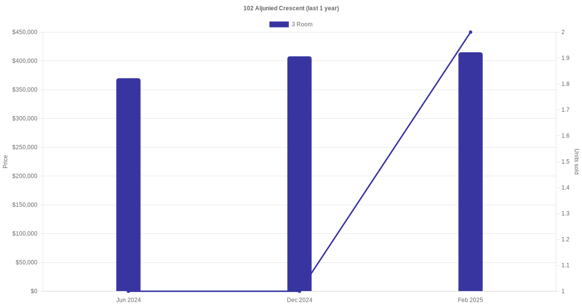 Below is a quick summary of the resale transactions volume and average price trends for the 3 room and 4 room units at 102 Aljunied Crescent.