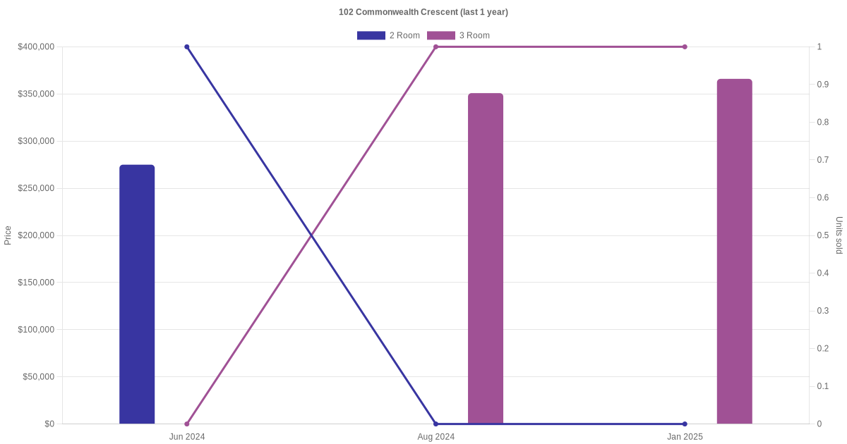 Below is a quick summary of the resale transactions volume and average price trends for the 2 room and 3 room units at 102 Commonwealth Crescent.