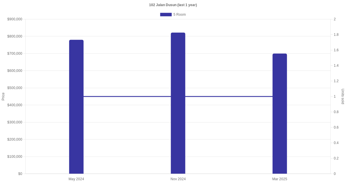 Below is a quick summary of the resale transactions volume and average price trends for the 5 room units at 102 Jalan Dusun.