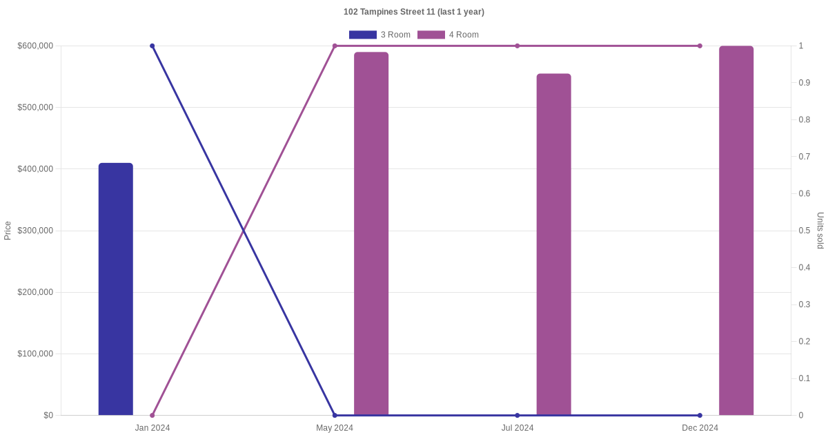 Below is a quick summary of the resale transactions volume and average price trends for the 3 room and 4 room units at 102 Tampines Street 11.