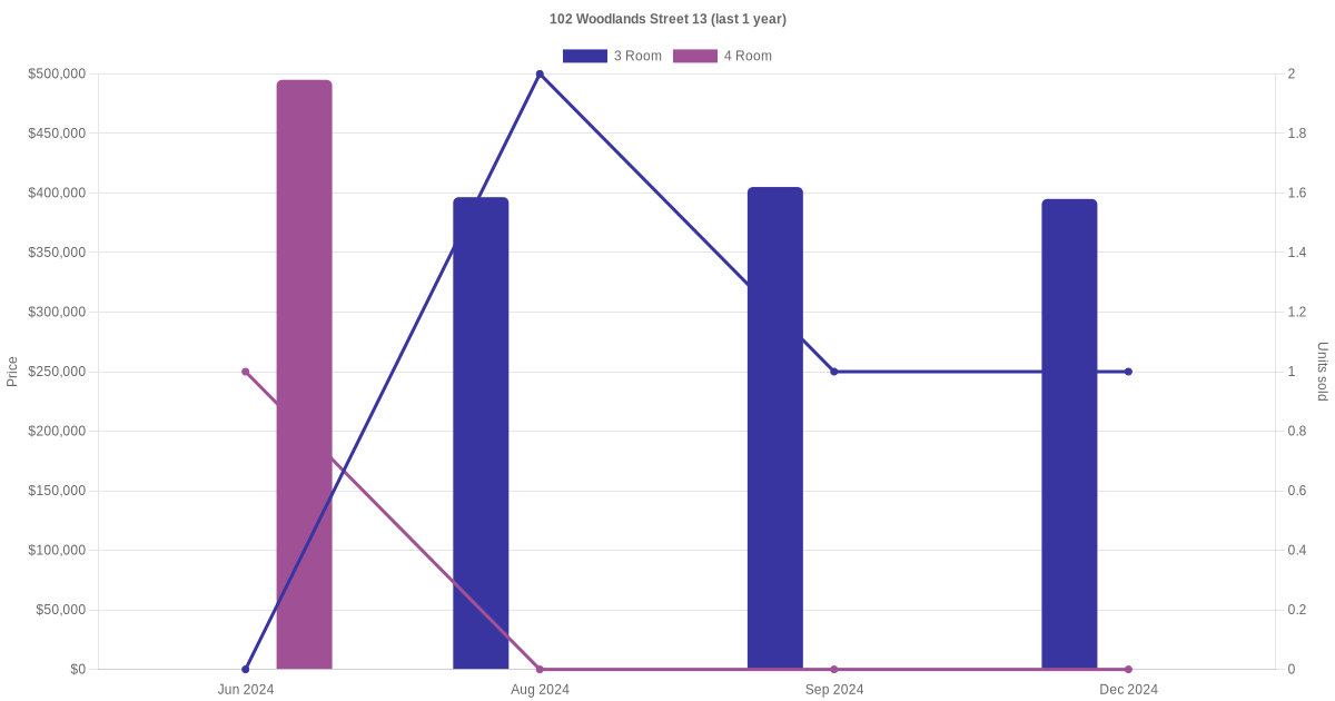 Below is a quick summary of the resale transactions volume and average price trends for the 3 room and 4 room units at 102 Woodlands Street 13.