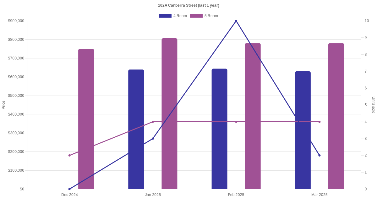 Below is a quick summary of the resale transactions volume and average price trends for the 4 room and 5 room units at 102A Canberra Street.