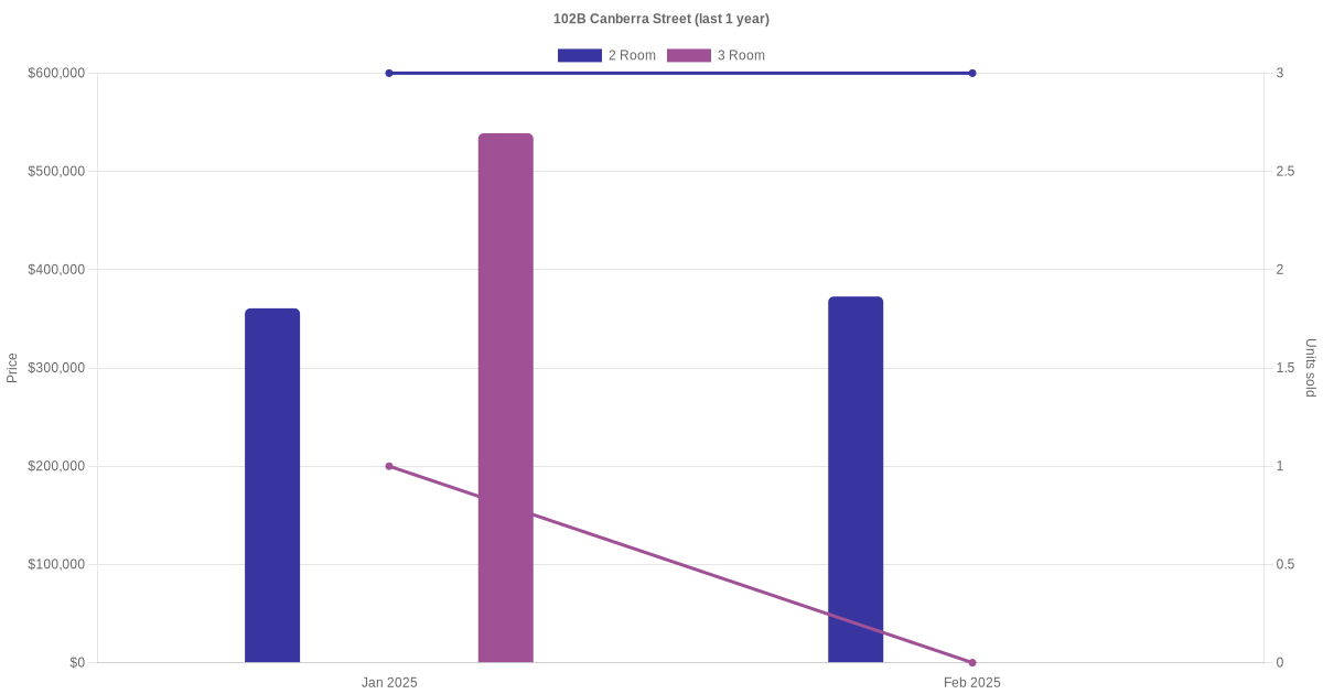 Below is a quick summary of the resale transactions volume and average price trends for the 2 room and 3 room units at 102B Canberra Street.