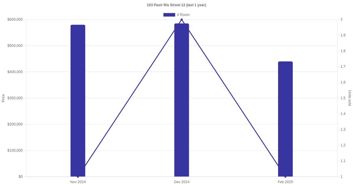 Below is a quick summary of the resale transactions volume and average price trends for the 4 room units at 103 Pasir Ris Street 12.