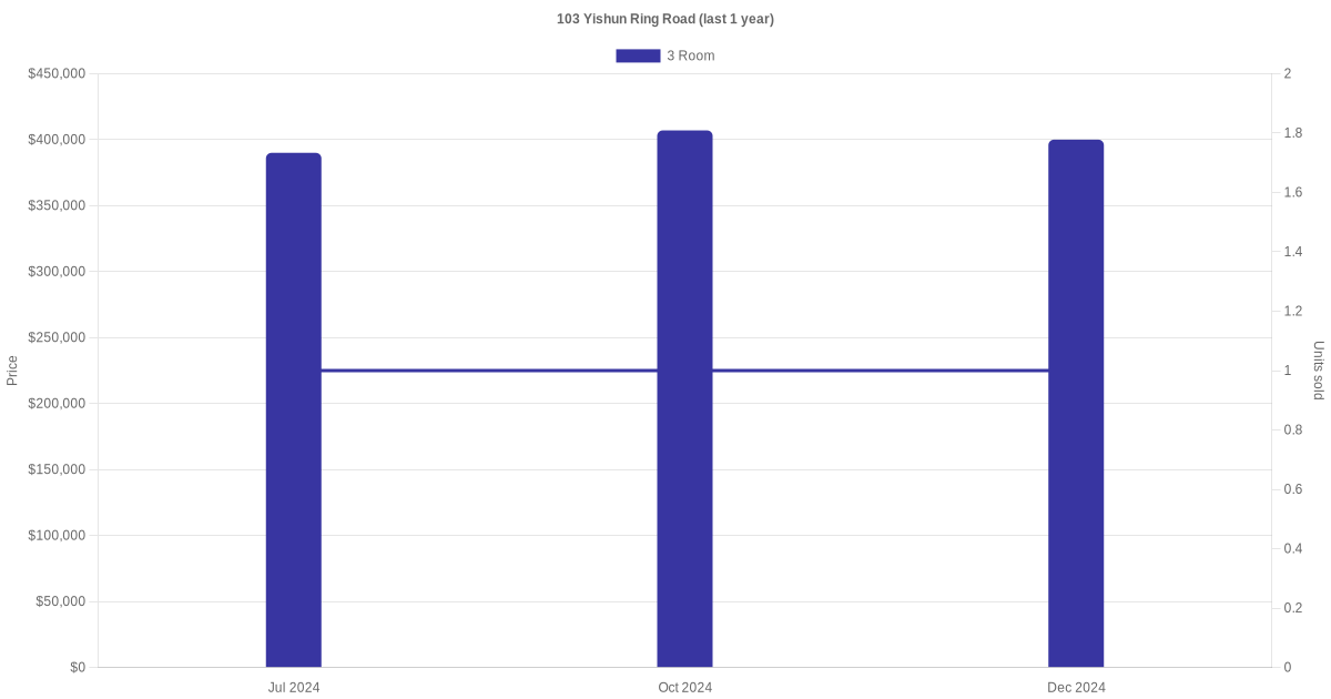 Below is a quick summary of the resale transactions volume and average price trends for the 3 room units at 103 Yishun Ring Road.