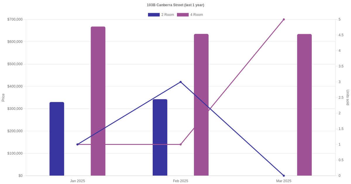 Here's a summary of the rental transactions and price trends for the 2 room, 3 room and 4 room units at 103B Canberra Street.