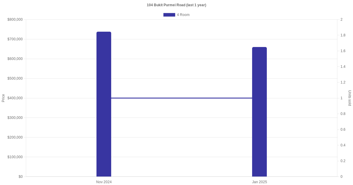 | Jan 2025 | $660,000 | $6,346 | 4 Room | Blk 104 Bukit Purmei Road 4 Room / 104 sqm | 04 to 06 | 104 sqm | Model A | 1984 |
