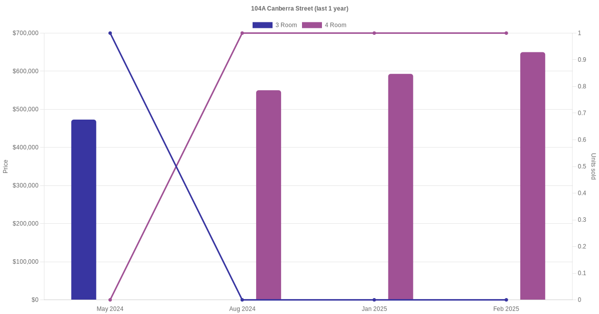 Below is a quick summary of the resale transactions volume and average price trends for the 3 room and 4 room units at 104A Canberra Street.