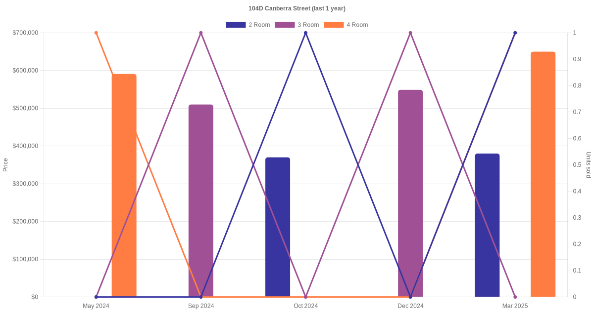 Here's a summary of the rental transactions and price trends for the 2 room, 3 room and 4 room units at 104D Canberra Street.