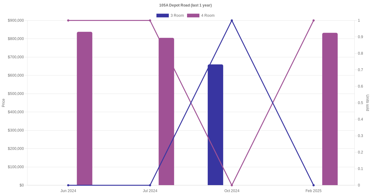 Below is a quick summary of the resale transactions volume and average price trends for the 3 room and 4 room units at 105A Depot Road.