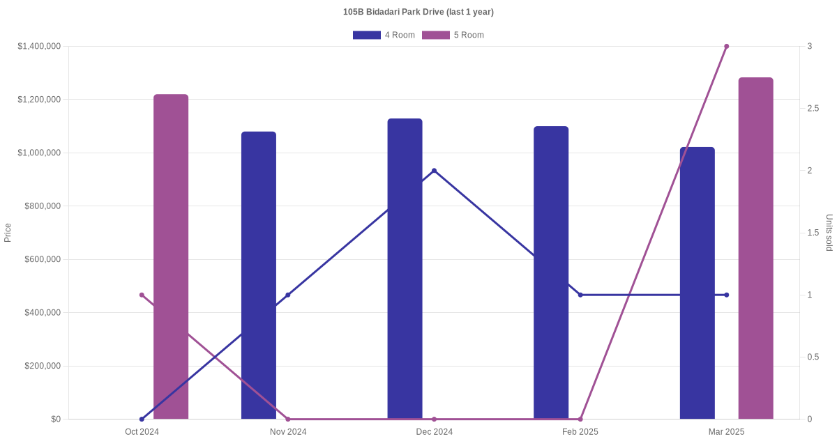 Below is a quick summary of the resale transactions volume and average price trends for the 4 room and 5 room units at 105B Bidadari Park Drive.