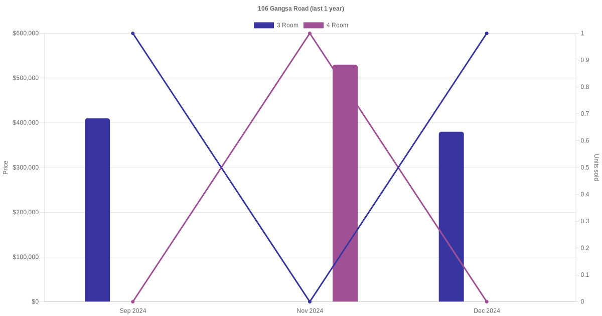 Below is a quick summary of the resale transactions volume and average price trends for the 3 room and 4 room units at 106 Gangsa Road.