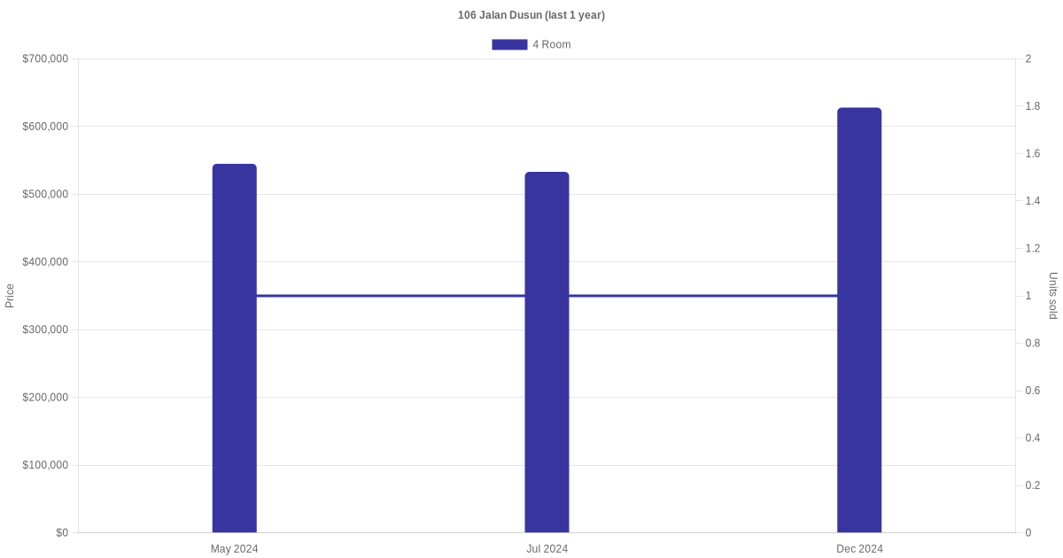 Below is a quick summary of the resale transactions volume and average price trends for the 4 room units at 106 Jalan Dusun.