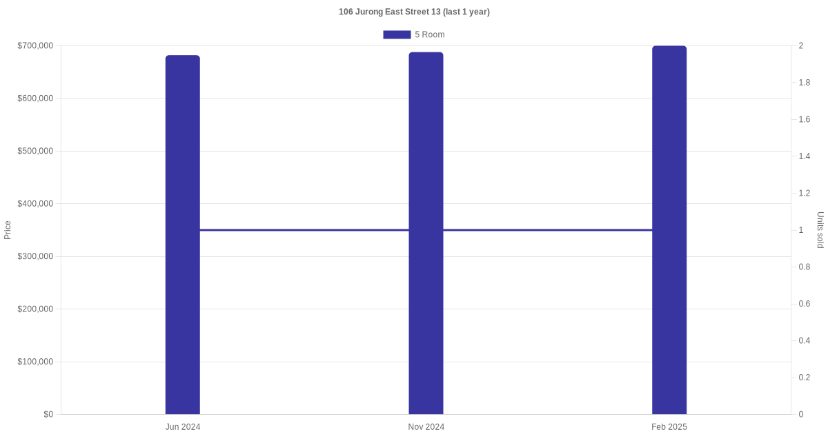 Below is a quick summary of the resale transactions volume and average price trends for the 5 room units at 106 Jurong East Street 13.