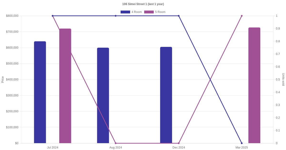 Below is a quick summary of the resale transactions volume and average price trends for the 4 room and 5 room units at 106 Simei Street 1.
