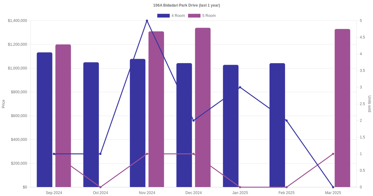 Below is a quick summary of the resale transactions volume and average price trends for the 4 room and 5 room units at 106A Bidadari Park Drive.