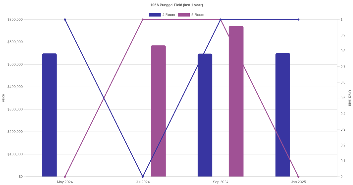There were a total of 13 resale transactions in the last 3 years for units in block 106A Punggol Field, with the latest one recorded in Jul 2025.
