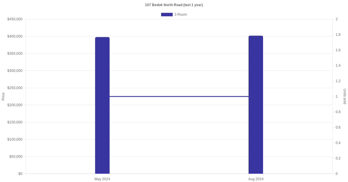 Below is a quick summary of the resale transactions volume and average price trends for the 3 room and 4 room units at 107 Bedok North Road.