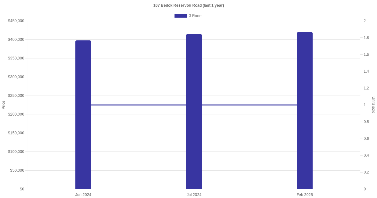 | Jun 2025 | $3,000 | 3 Room | Blk 107 Bedok Reservoir Road 3 Room | Bedok |