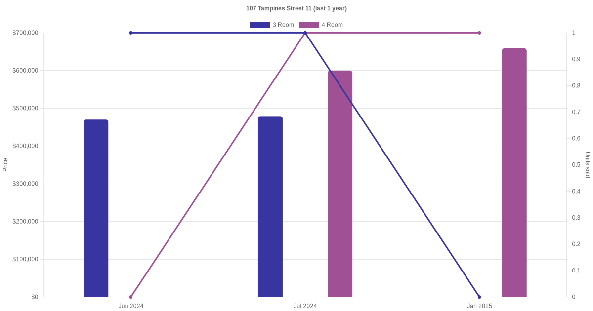 Below is a quick summary of the resale transactions volume and average price trends for the 3 room and 4 room units at 107 Tampines Street 11.