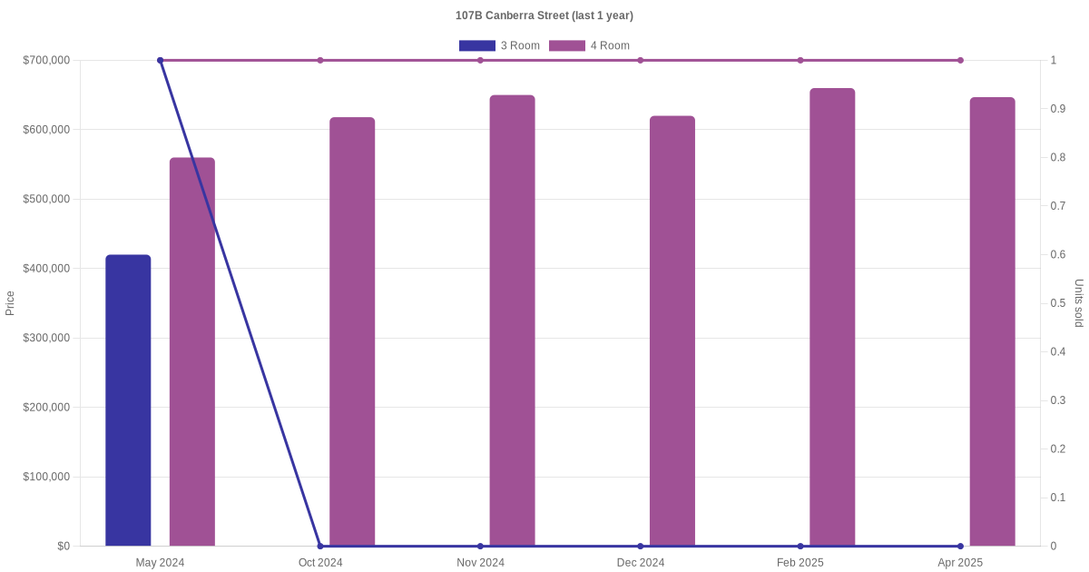 Below is a quick summary of the resale transactions volume and average price trends for the 3 room and 4 room units at 107B Canberra Street.