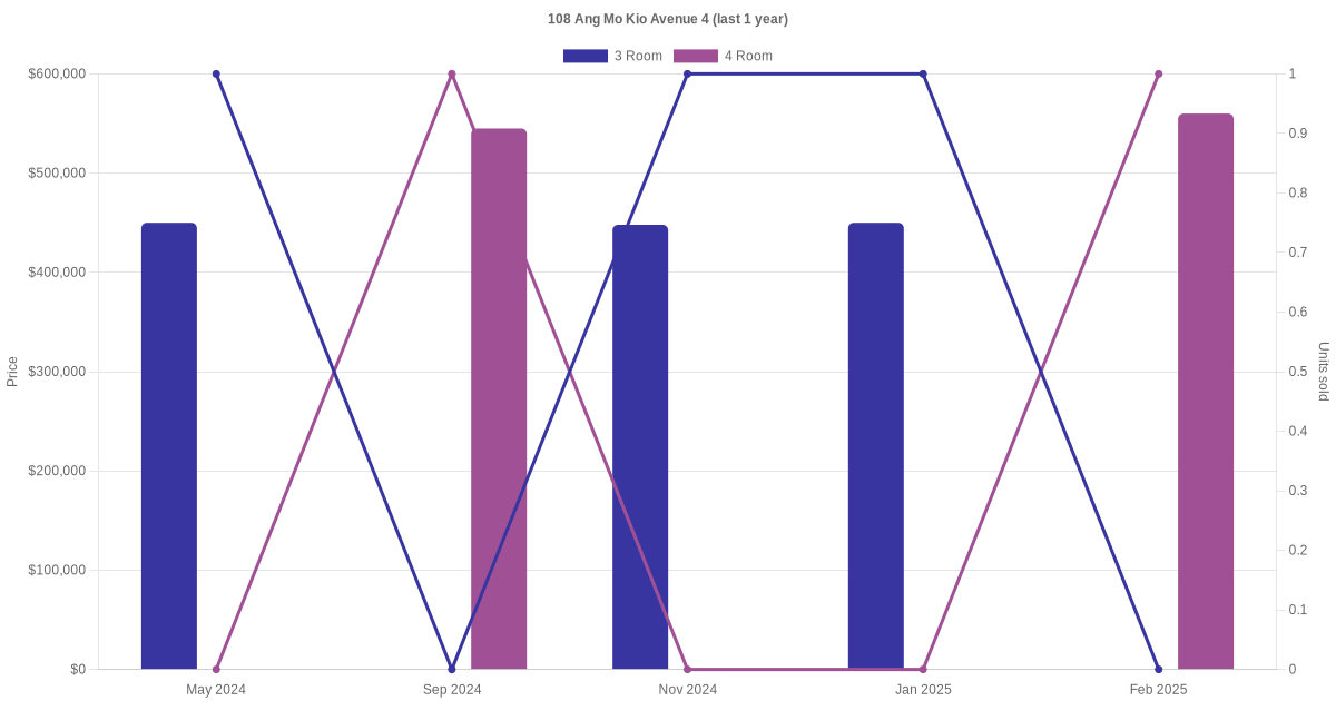 Below is a quick summary of the resale transactions volume and average price trends for the 3 room and 4 room units at 108 Ang Mo Kio Avenue 4.
