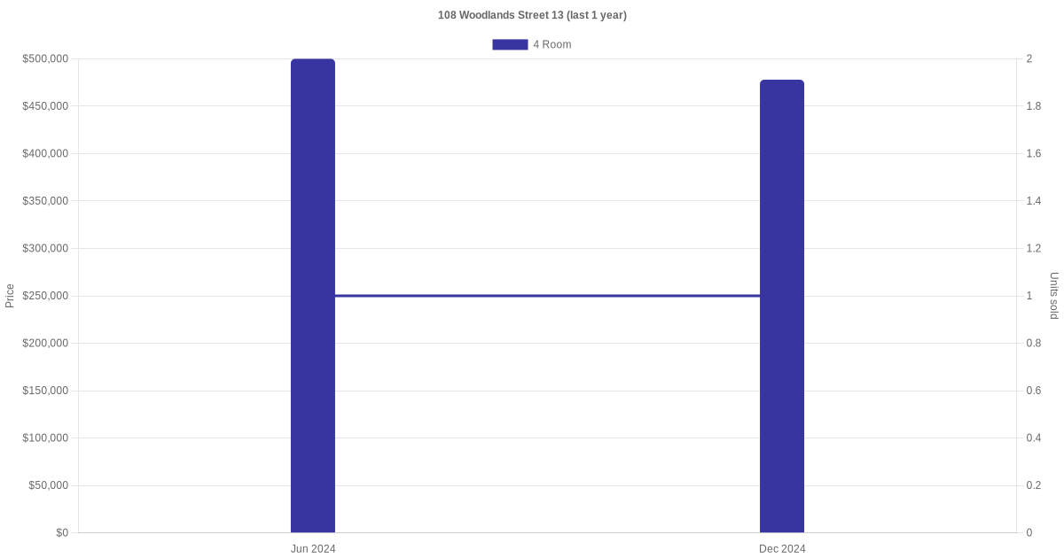 Below is a quick summary of the resale transactions volume and average price trends for the 4 room units at 108 Woodlands Street 13.