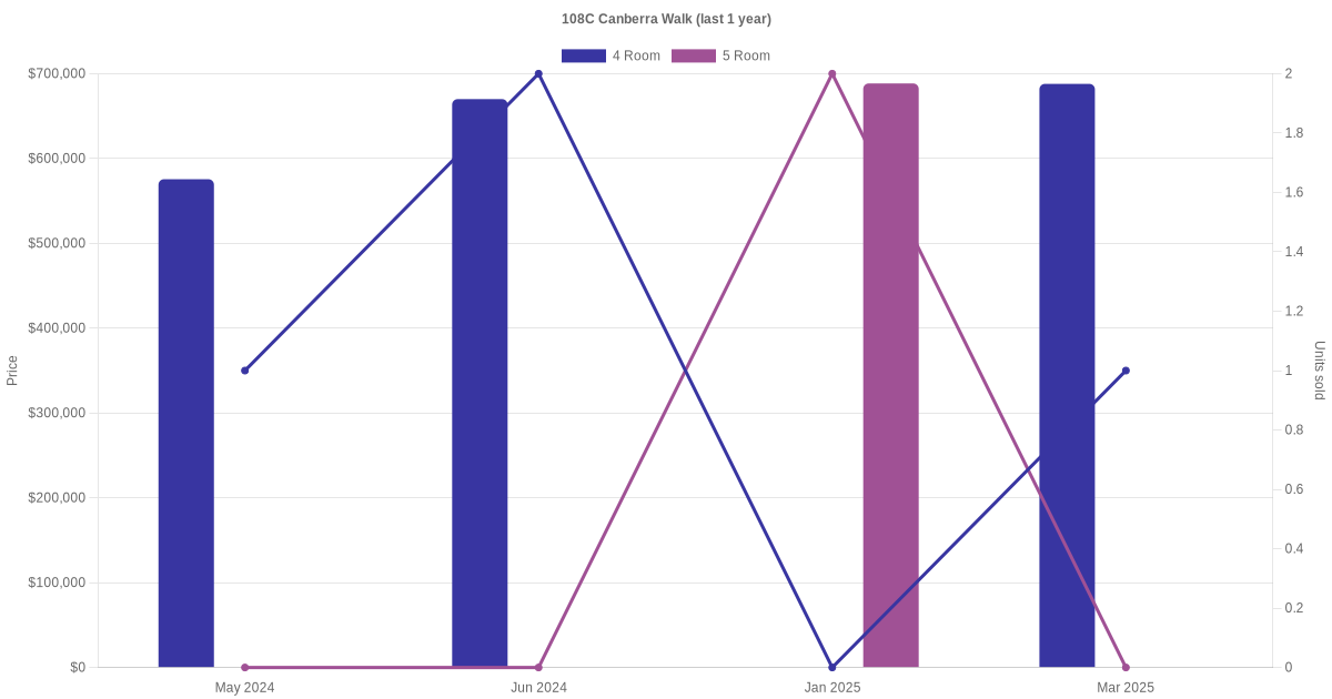 Below is a quick summary of the resale transactions volume and average price trends for the 4 room and 5 room units at 108C Canberra Walk.