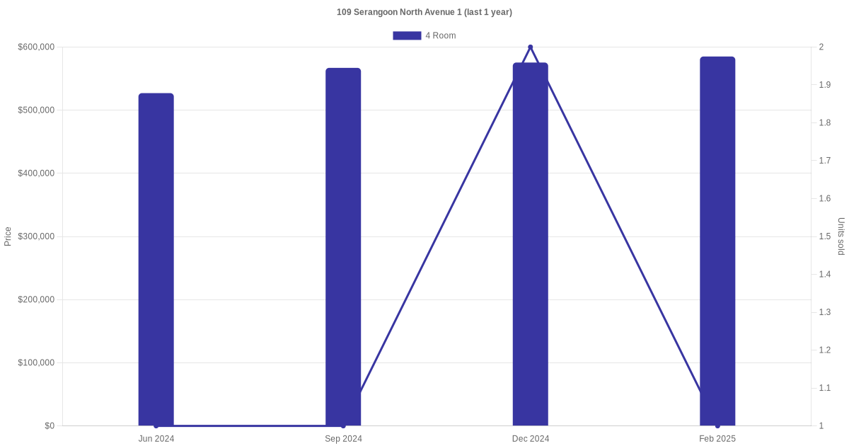 Below is a quick summary of the resale transactions volume and average price trends for the 4 room units at 109 Serangoon North Avenue 1.