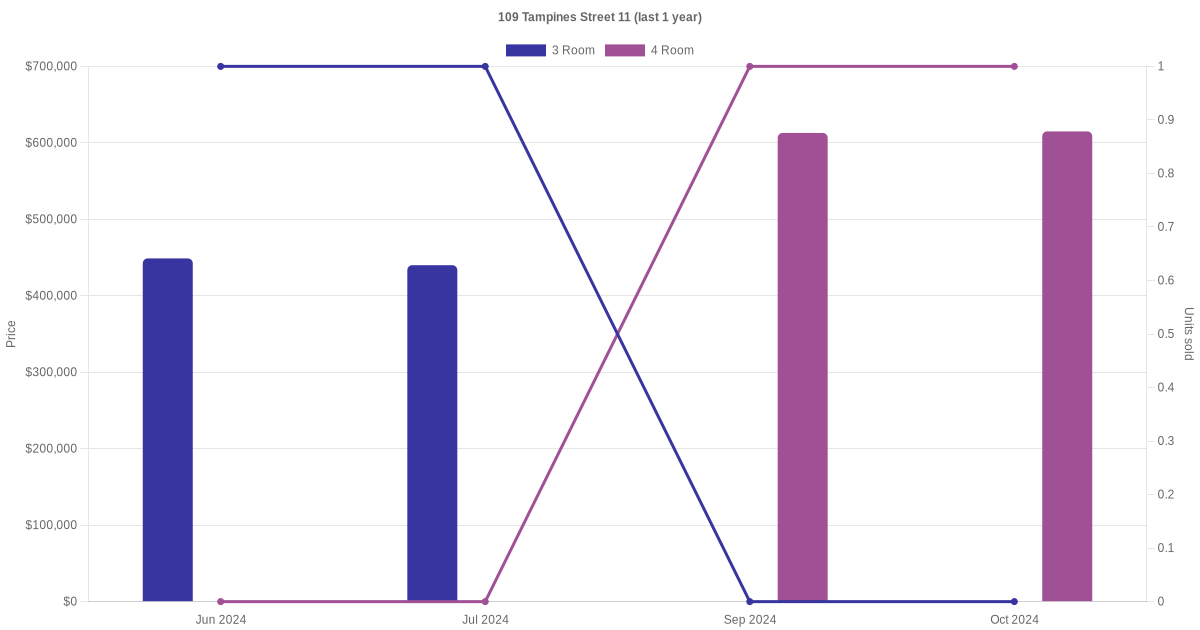 Below is a quick summary of the resale transactions volume and average price trends for the 3 room and 4 room units at 109 Tampines Street 11.