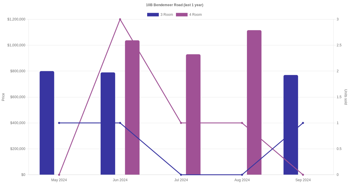 Below is a quick summary of the resale transactions volume and average price trends for the 3 room and 4 room units at 10B Bendemeer Road.