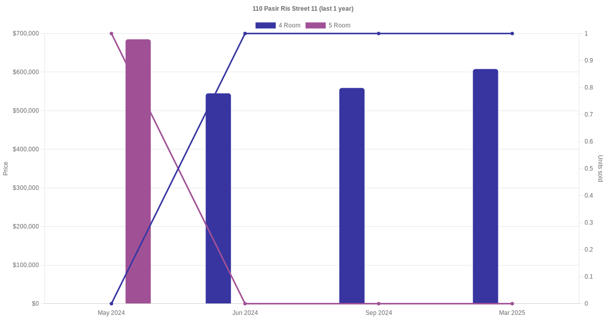 Below is a quick summary of the resale transactions volume and average price trends for the 4 room and 5 room units at 110 Pasir Ris Street 11.