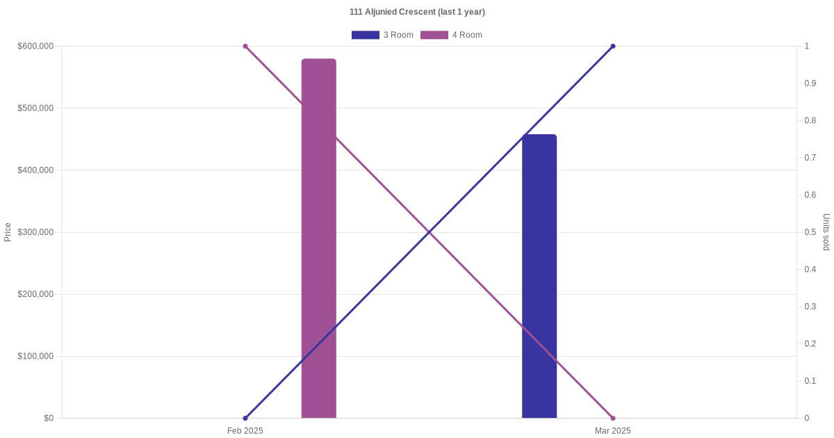 Below is a quick summary of the resale transactions volume and average price trends for the 3 room and 4 room units at 111 Aljunied Crescent.