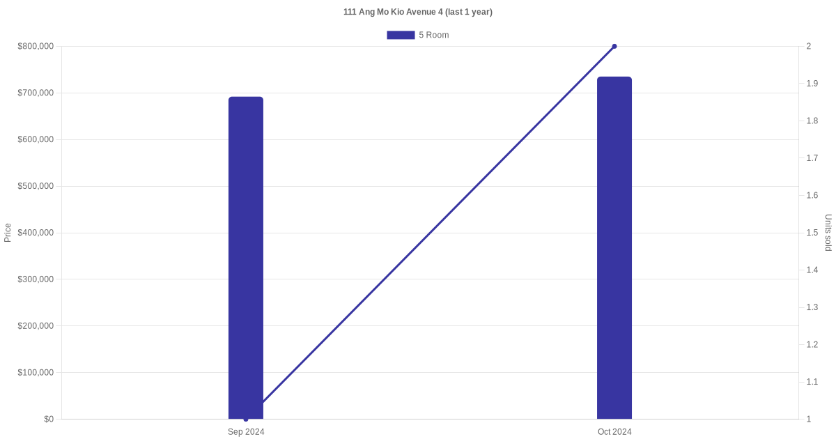 Below is a quick summary of the resale transactions volume and average price trends for the 4 room and 5 room units at 111 Ang Mo Kio Avenue 4.