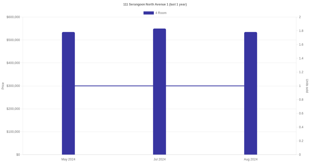 Below is a quick summary of the resale transactions volume and average price trends for the 4 room units at 111 Serangoon North Avenue 1.