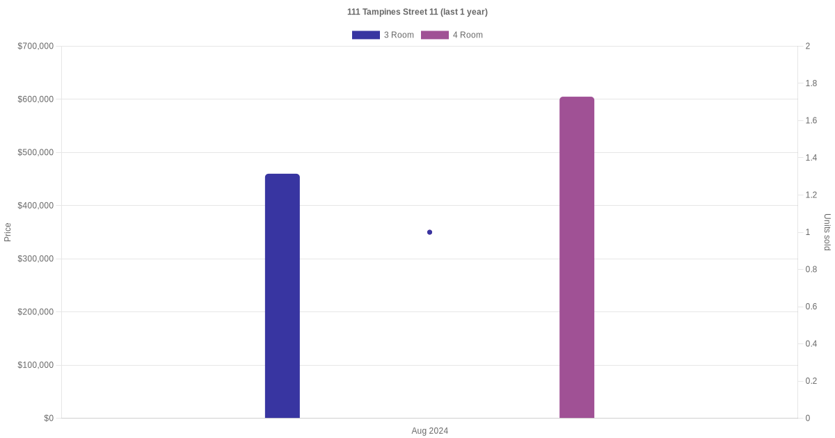 Below is a quick summary of the resale transactions volume and average price trends for the 3 room and 4 room units at 111 Tampines Street 11.