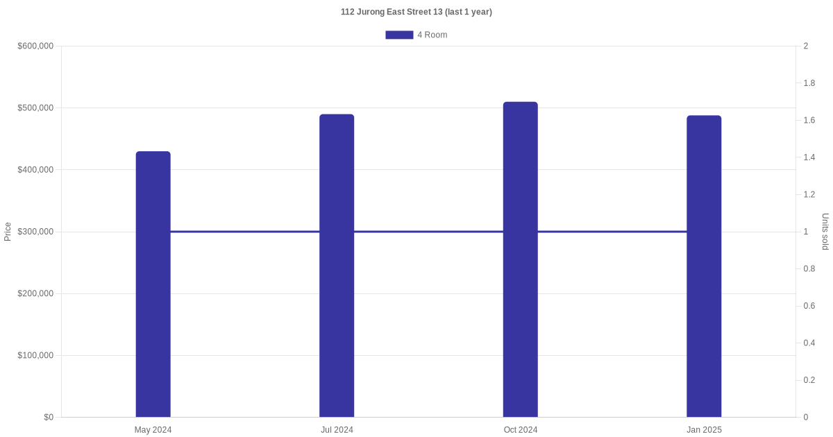 Below is a quick summary of the resale transactions volume and average price trends for the 4 room units at 112 Jurong East Street 13.