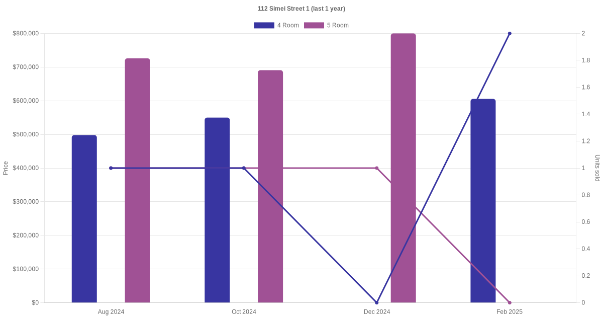 Below is a quick summary of the resale transactions volume and average price trends for the 4 room and 5 room units at 112 Simei Street 1.