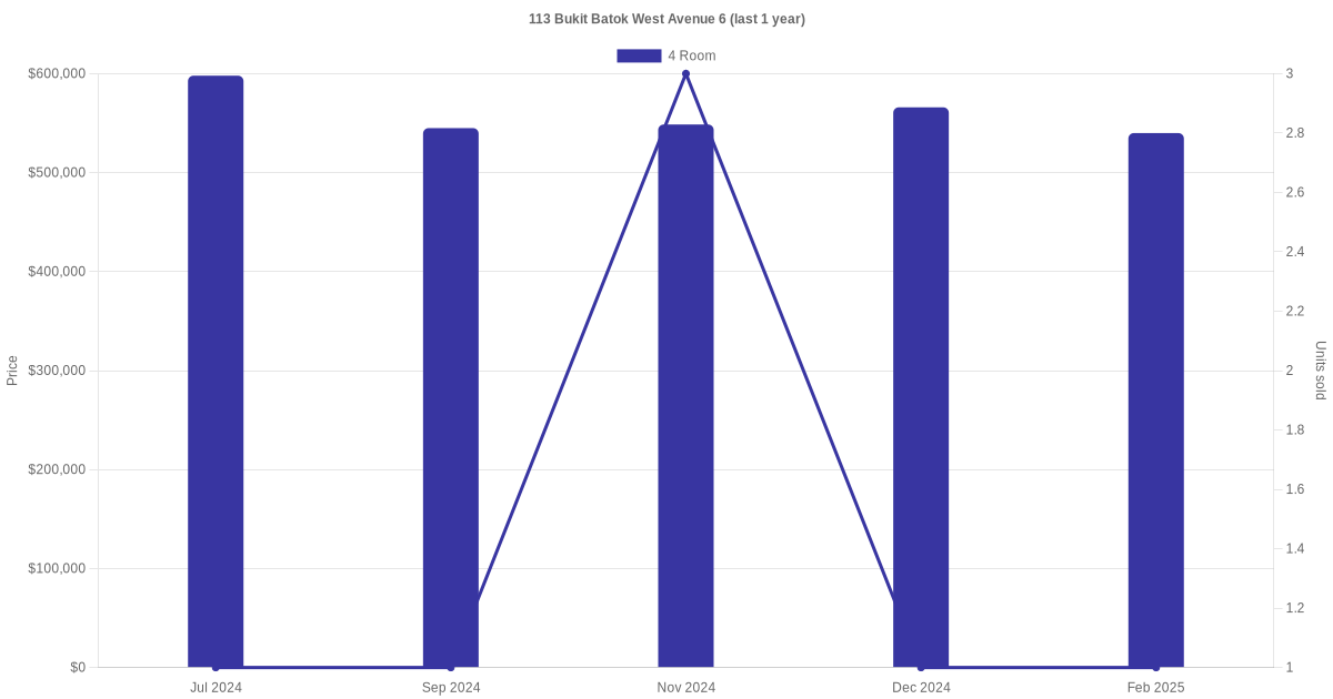 Below is a quick summary of the resale transactions volume and average price trends for the 4 room units at 113 Bukit Batok West Avenue 6.