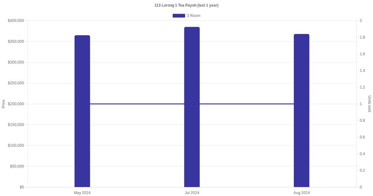 Below is a quick summary of the resale transactions volume and average price trends for the 3 room units at 113 Lorong 1 Toa Payoh.