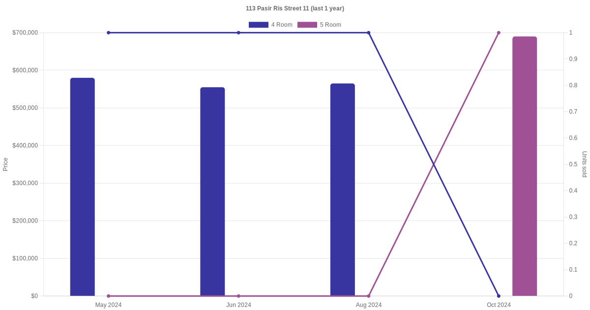 Below is a quick summary of the resale transactions volume and average price trends for the 4 room and 5 room units at 113 Pasir Ris Street 11.