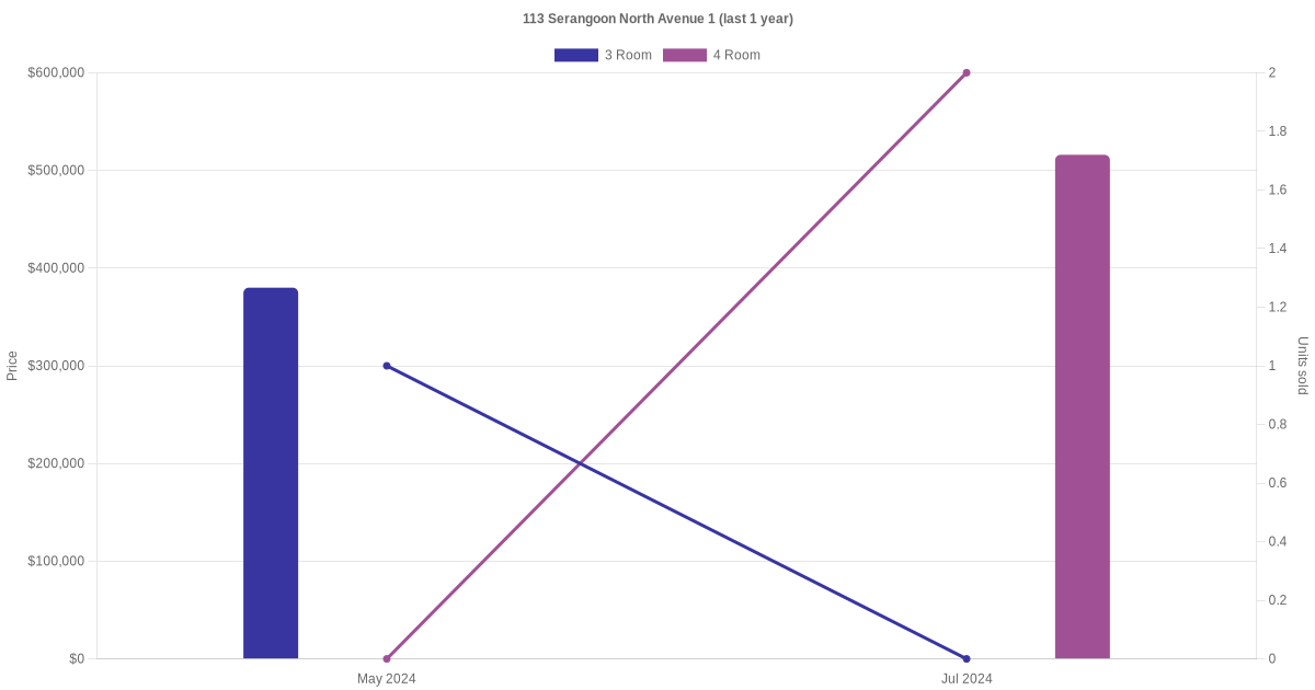 There were a total of 4 resale transactions in the last 3 years for units in block 113 Serangoon North Avenue 1, with the latest one recorded in Jul 2024.