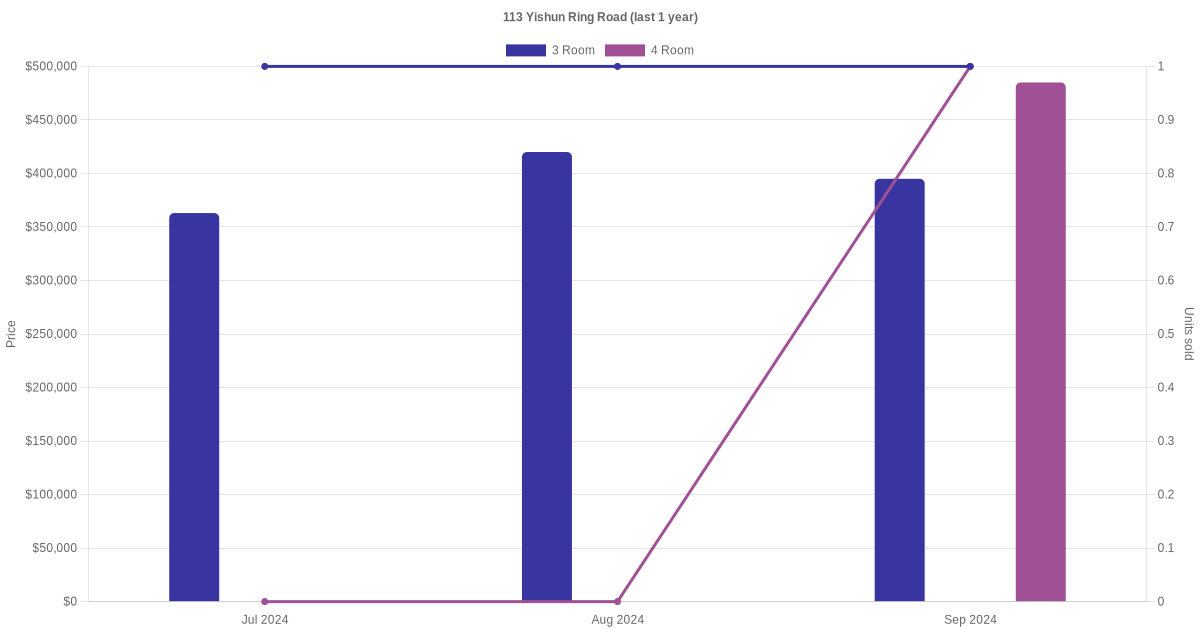Below is a quick summary of the resale transactions volume and average price trends for the 3 room and 4 room units at 113 Yishun Ring Road.